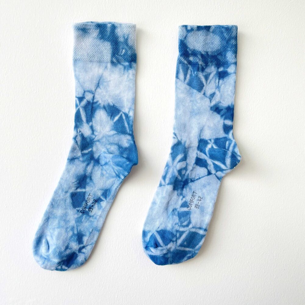 These socks are hand-dyed with indigo harvested in Amsterdam in 2024.